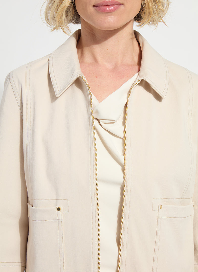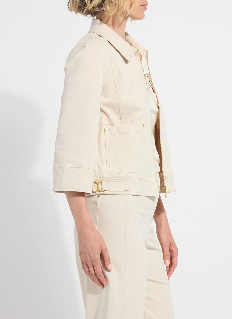 The modern Nylah Detail Crop Jacket, made from Refined 4-Way Stretch Gaberdine, offers a sleek look, cropped length and contrast-color topstitching. Detailing includes A-line bracelet sleeves, patch pockets with Light Shine Gold studs, a waist buckle, front zipper, and true-to-size fit. Style with a Lyssé White tee and the Nylah Detail Wide Leg Crop Pant.