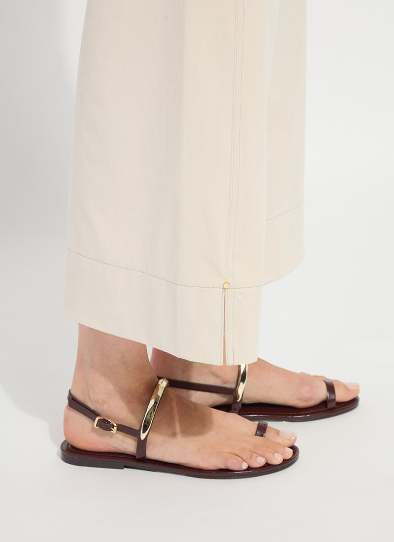 The Nylah Detail Wide Leg Crop Pant, made from Refined 4-Way Stretch Gaberdine, offers a concealed patented waistband, wide leg and side seams that are shifted to the front for a slimmer looking hip. Detailing includes side waist buckles in Light Shine Gold, back patch pockets, a high hemline and facing, and front hem slits with studs. Fitted at the waist, the Nylah Pant skims the hips before opening into a wide leg. Style with our Silk Scarf looped through the side waist buckle, a tucked Lyssé tee and Nylah Detail Crop Jacket.