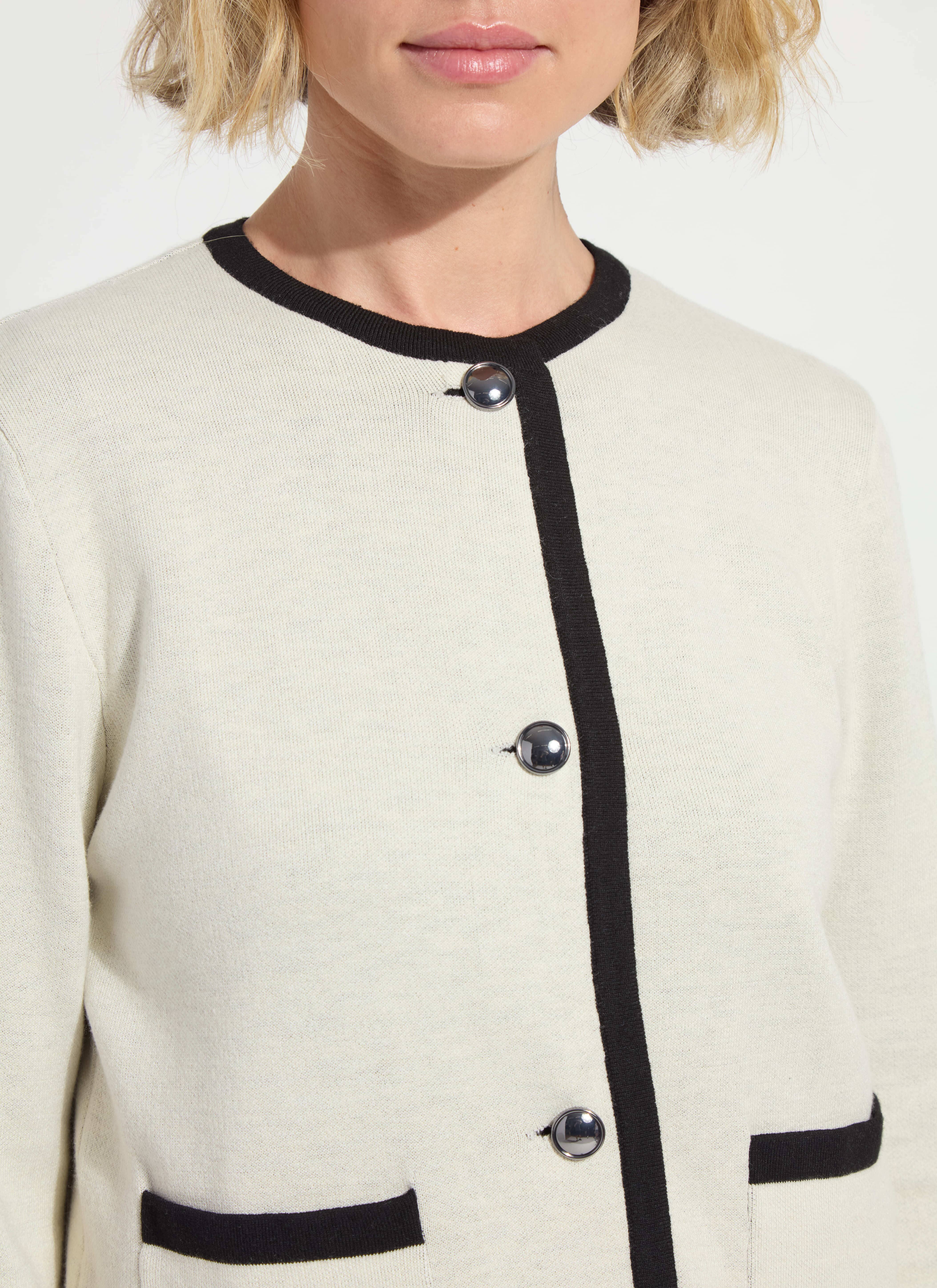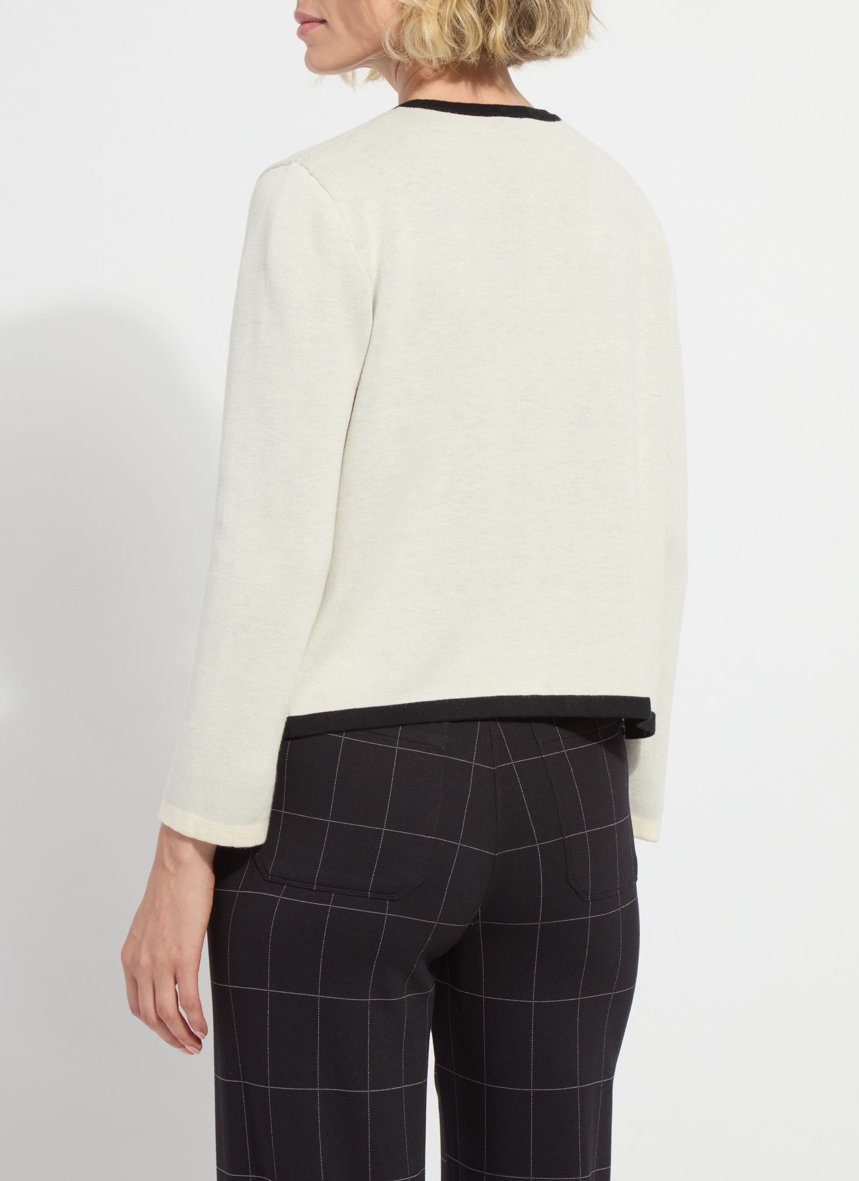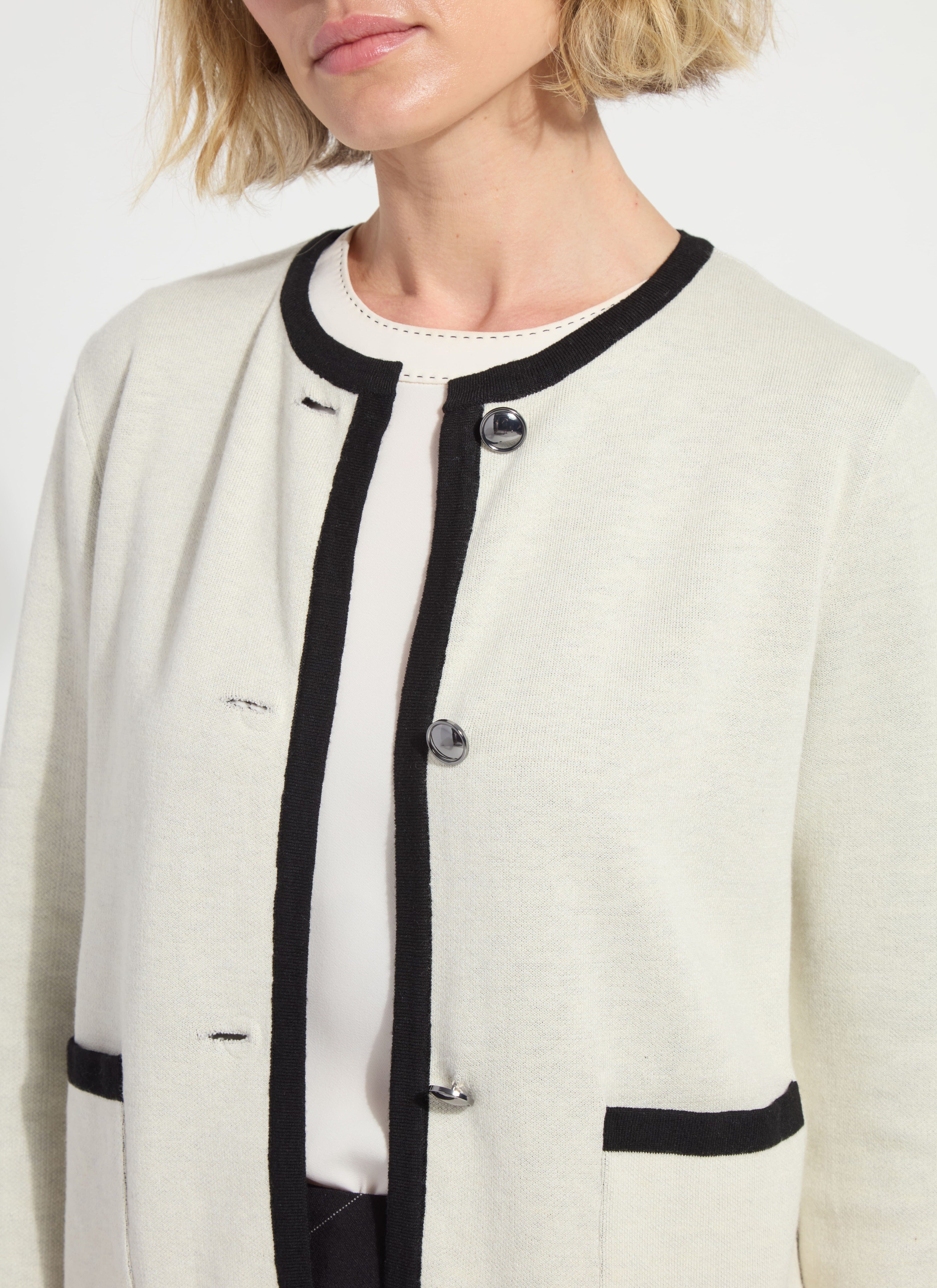 Made with Light Weight Double Face Cashmere, the Amal Sweater Jacket offers bracelet sleeves that can be cuffed, a cropped length, true-to-size fit and classic jacket styling you’ll cherish for years to come. Super soft and cozy, the Amal Sweater Jacket showcases a Black interior and Chalk white exterior with high-shine Gunmetal buttons and interesting binding. Style with the Kavita Crew Neck Contrast Stitching Shell, Erin High Waist Wide Leg Ponte pant and sandals. Machine wash and lay flat to dry. Store folded, never hung.
