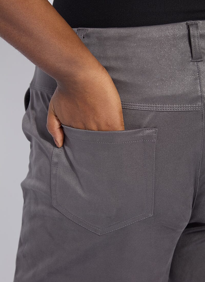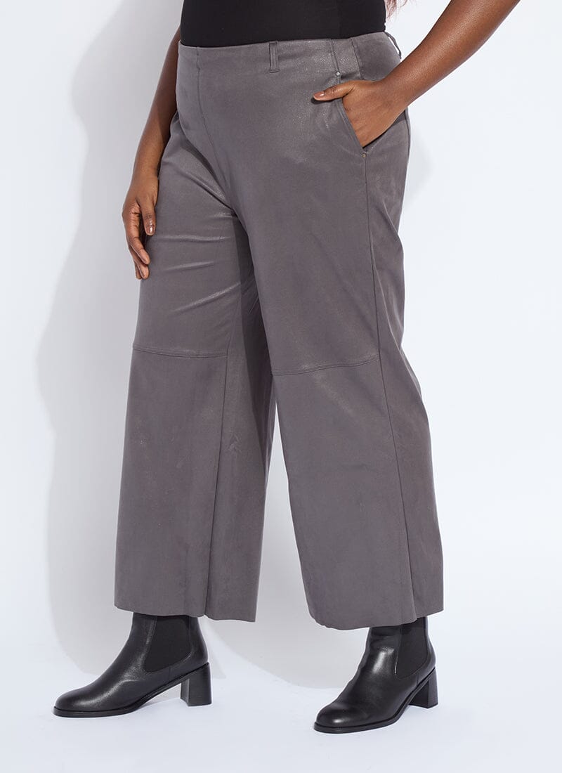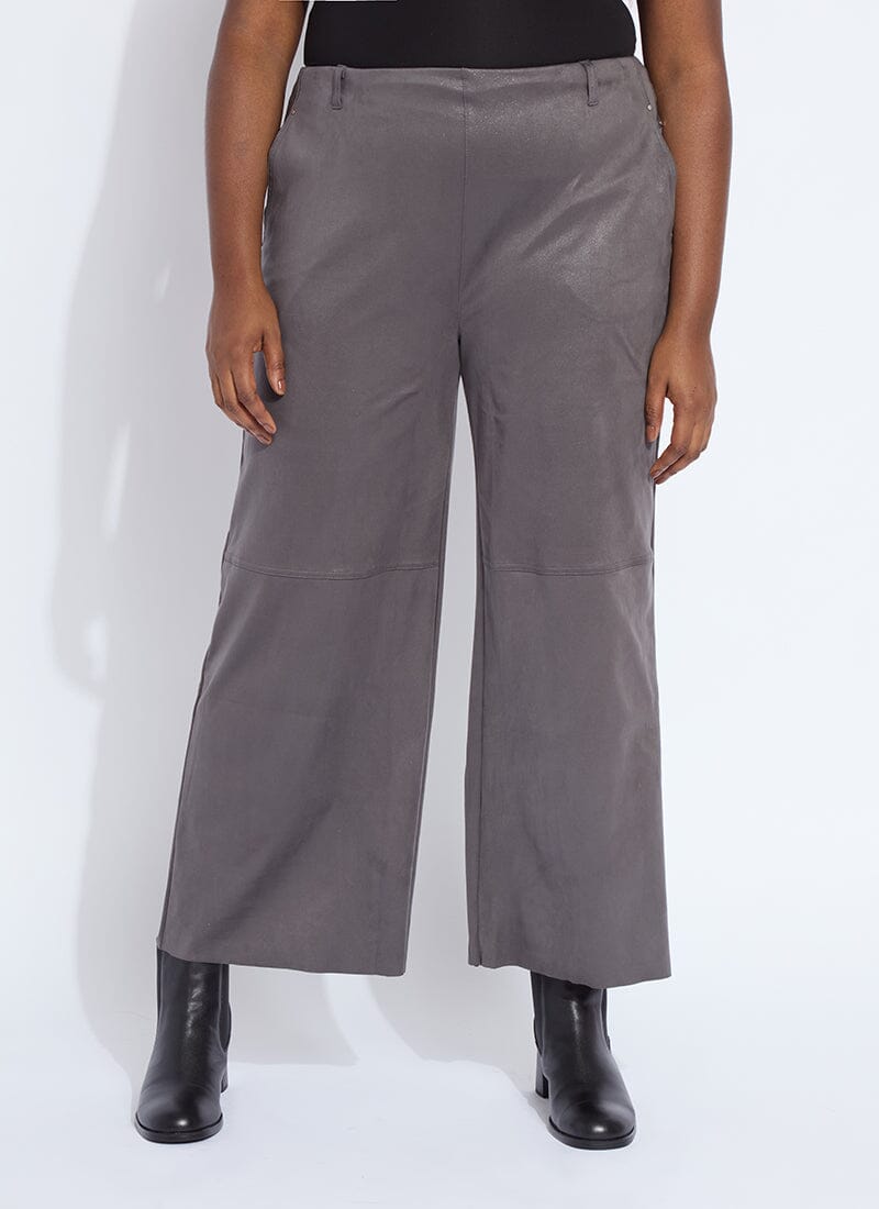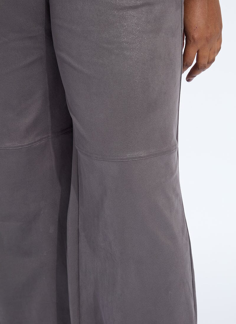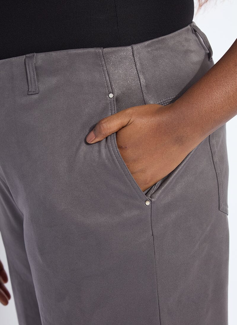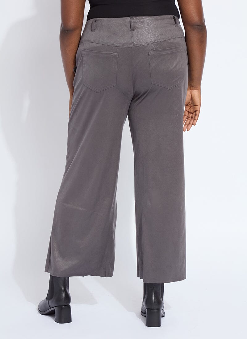 The Amina Patent Foil Vegan Suede Pant offers a concealed patented waistband, front functional pockets with high-shine silver studs, back patch pockets, a back yoke and a raw-edge hem that’s easy to shorten. Made with Patent Foil Vegan Suede for a liquid foil effect, these cropped, wide-leg pants feature horizontal knee seams that replicate genuine suede. We love these festive Vegan Suede pants styled with our chic Hadley Cozy Short Slv Embellished Cable Sweater and boots. Turn inside out to machine wash and air dry.