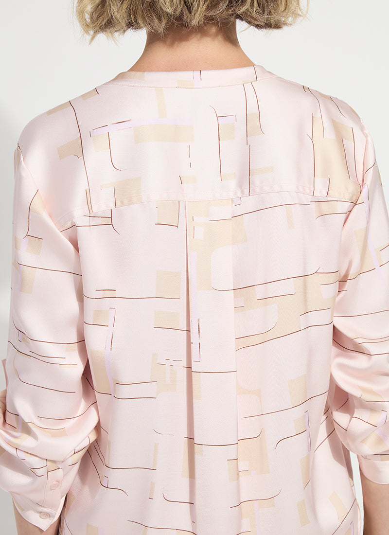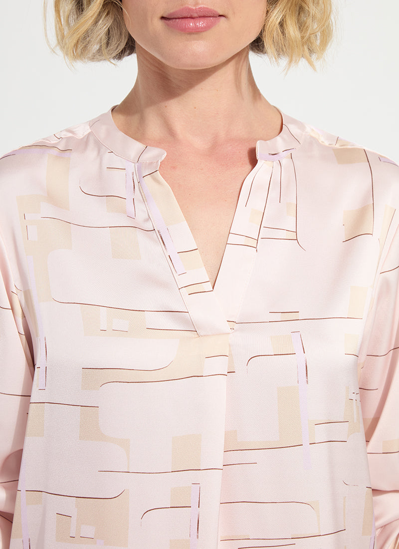 Made from luxe Soft Touch Satin, the Ashanti Roll Tab Printed V neck Shirt features a true-to-size fit, double self-yoke, pull-on styling, a front pleat and ¾ sleeves with tabs. Showcasing a lovely custom print designed in Copenhagen, the Ashanti also offers a high-low, rounded hem that’s easy to tuck. Wear it with our Iris Wide Leg Everyday Denim jean and matching Willow Everyday Denim Jacket. Gently steam to remove wrinkles.