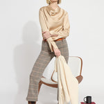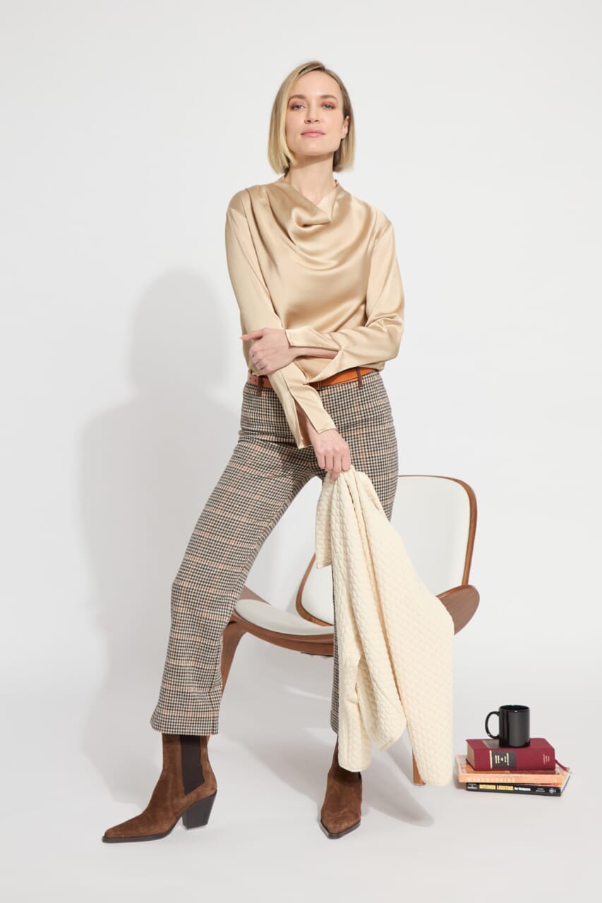 Made from 2-way stretch Brushed Ponte Jacquard, the work or leisure Baby Bootcut Ankle Pant offers pull-on styling, a concealed patented waistband, and a slightly flared, ankle-length hem with side slits. These bootcut pants are rich in detail with studded back pockets, back yoke, back waist, belt loops, and slimming front seaming. Partner these bootcut crops with our High Cowl Neck Blouse, mules and the Salma Sweater Coat.