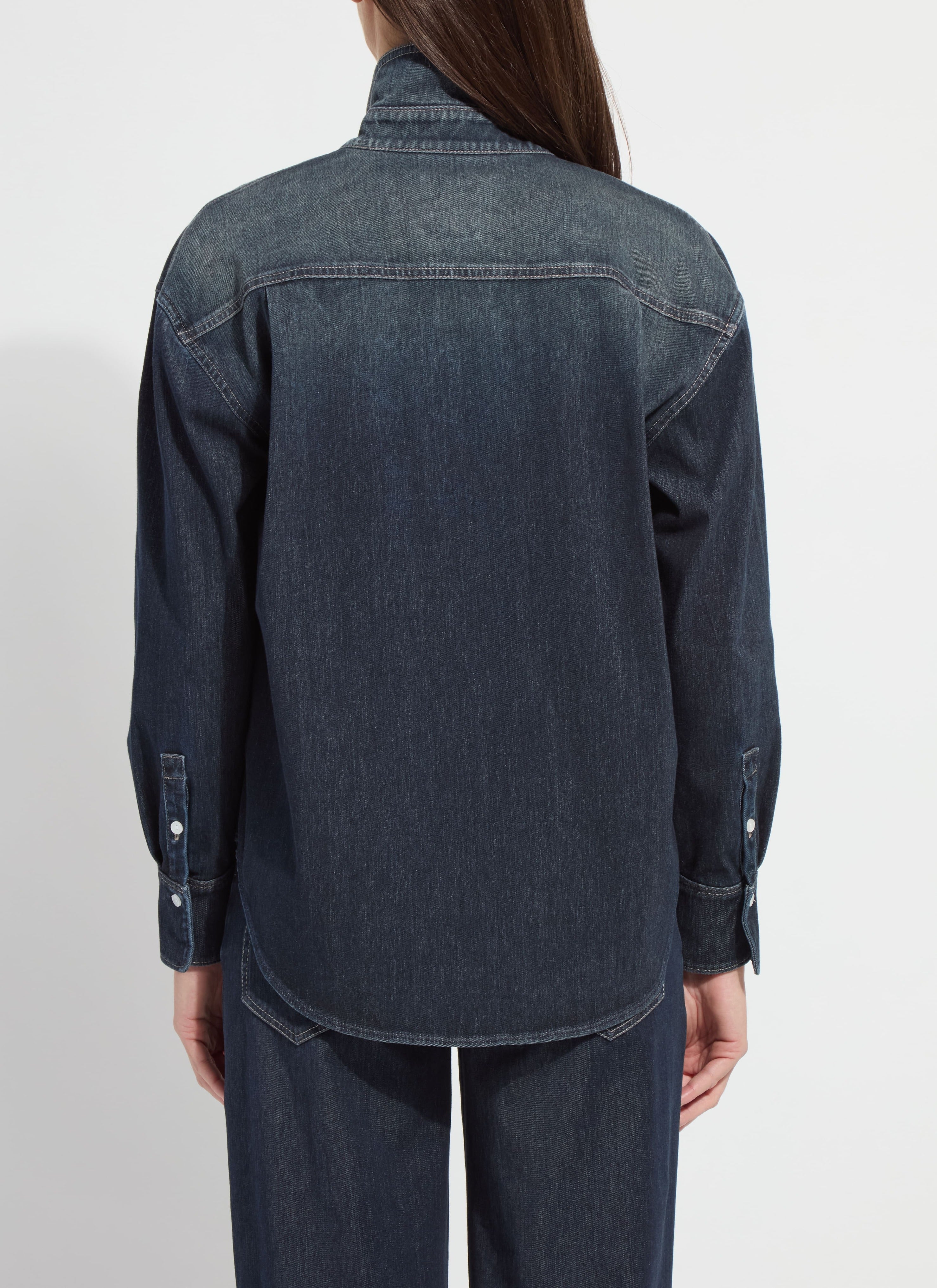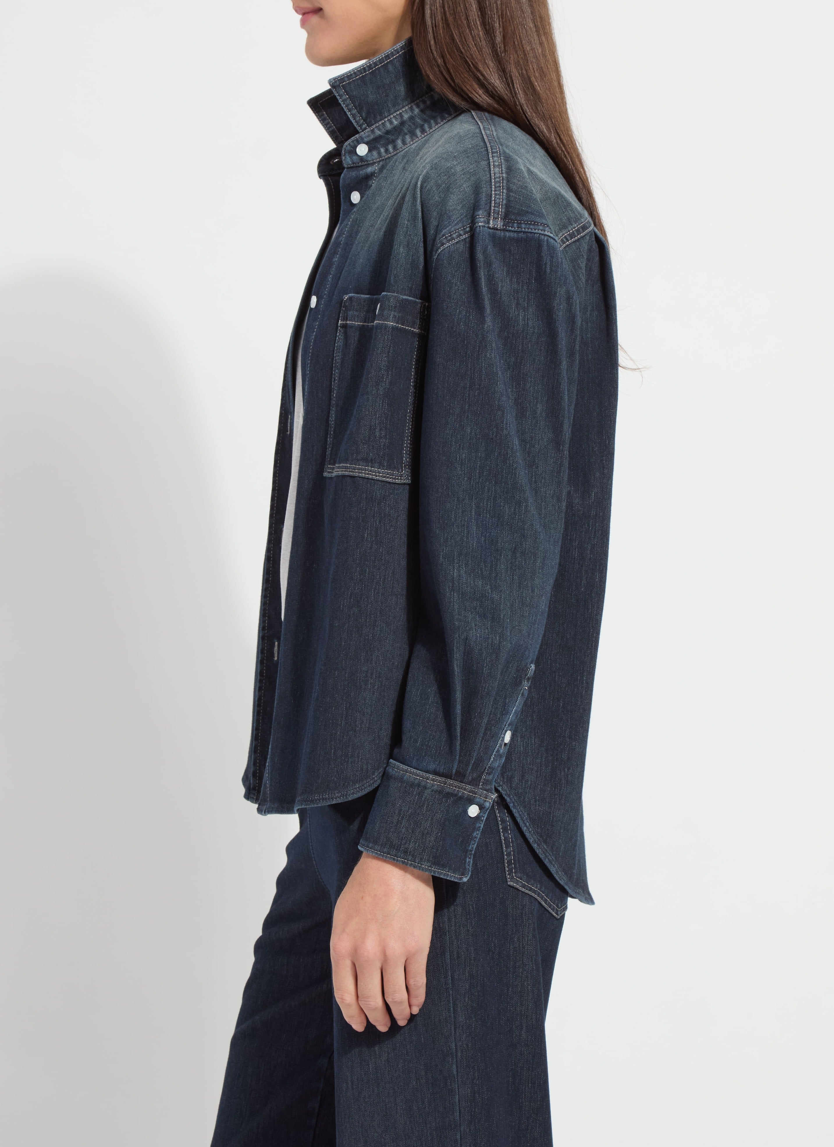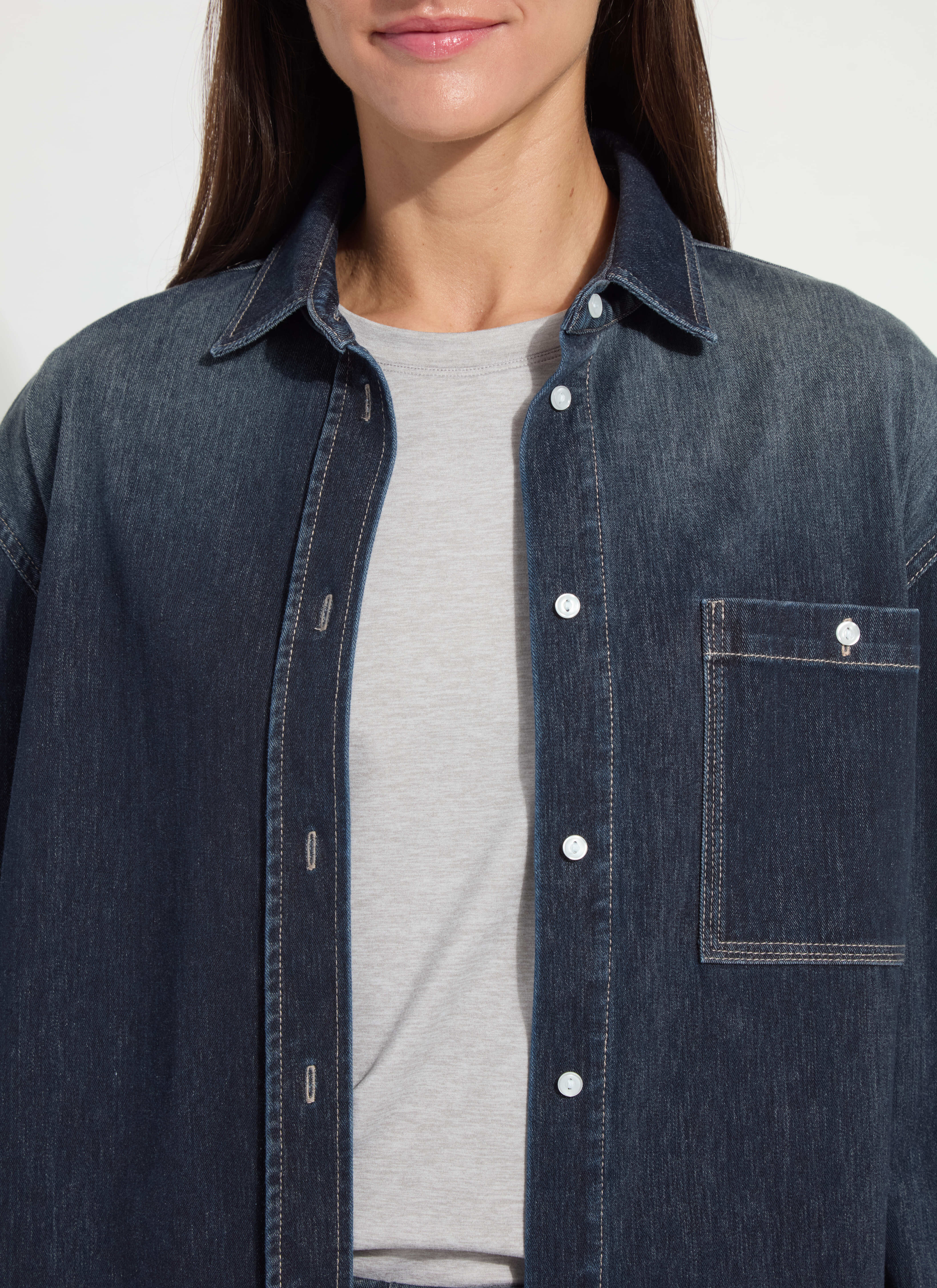 Made from 4-way stretch Nu-Denim, the Cassidy Denim Shacket offers a lighter weight than most denim shirts and natural vertical stripes for more personality. It features drop shoulders, a cropped length, White buttons and a placed ombre effect at the front yoke and under collar. Style with the Avril Sculpting tank and matching Samara Cuffed Wide Leg Denim pant.