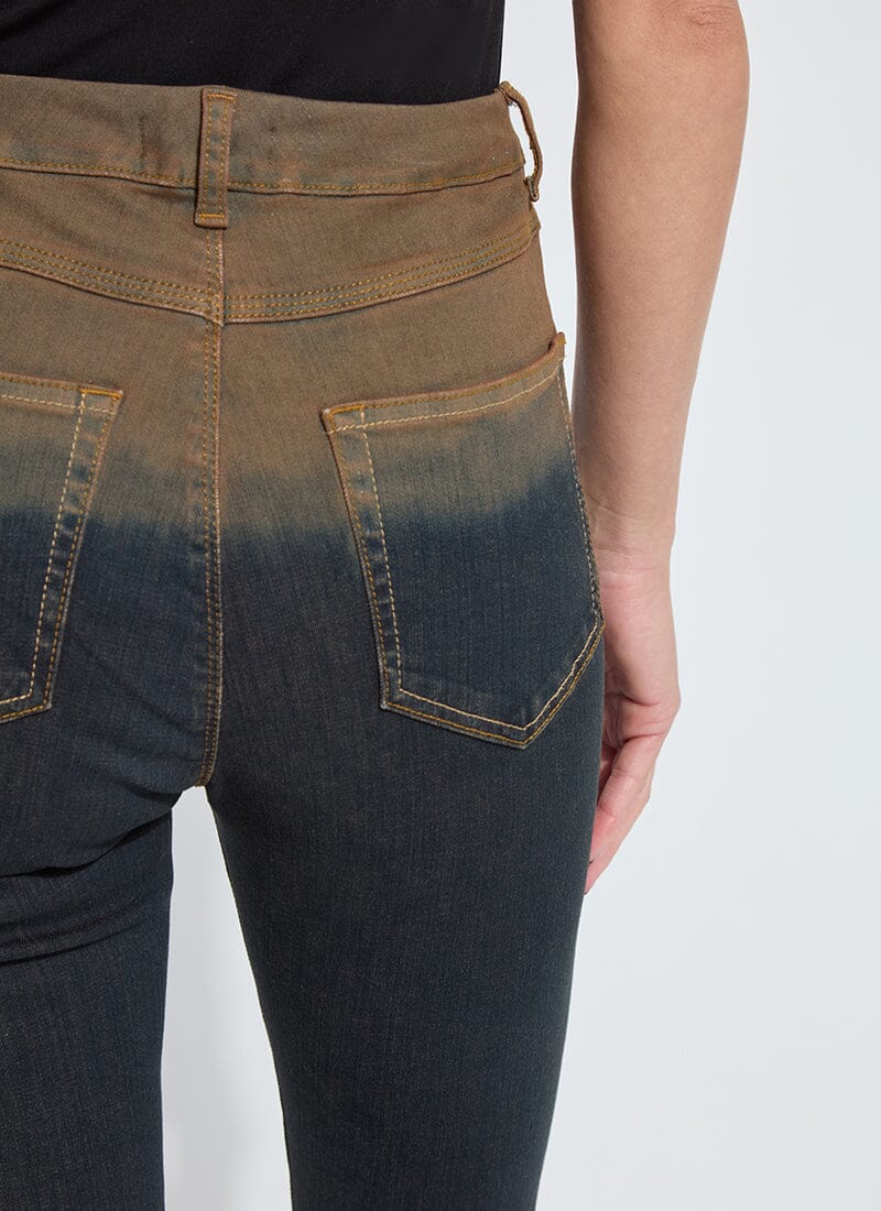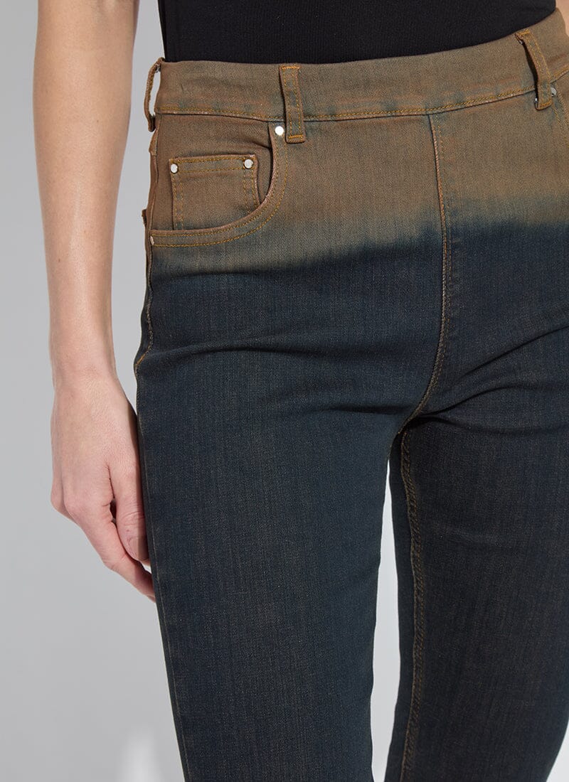 These slim flare jeans showcase an authentic denim look with tobacco topstitching, a faux front, back pockets and beltloops. Made from “Holding Power” Denim – a woven denim that adapts to all shapes – the Ceri Slim Flare Premium Denim jean keeps its shape and has an ultra-soft feel. Fitted at the waist and slim through the hip, thigh and knee before opening into a flared hem, these jeans are dip dyed from pockets to waist and feature a concealed patented waistband, 2-way stretch and pull-on styling. Coordinate the Ceri Slim Flare Premium Denim jeans with the Essential Longsleeve Turtleneck and Amelia Moto Jacket. Size up if between sizes.
