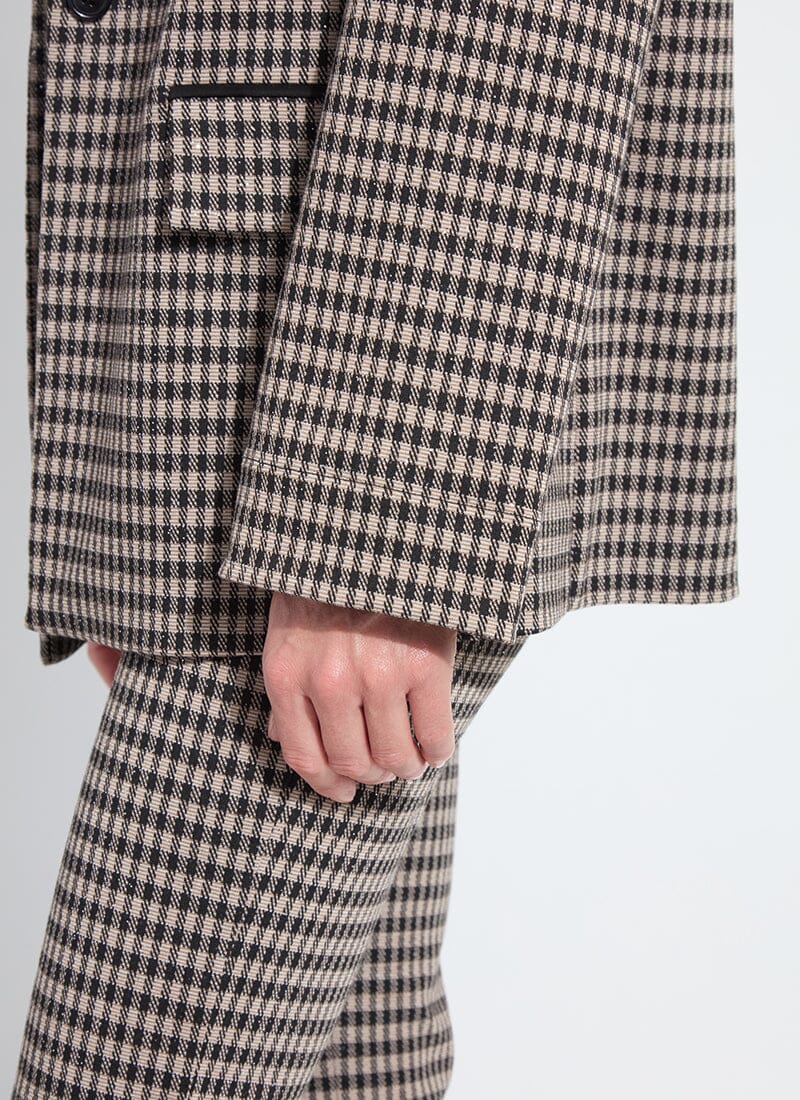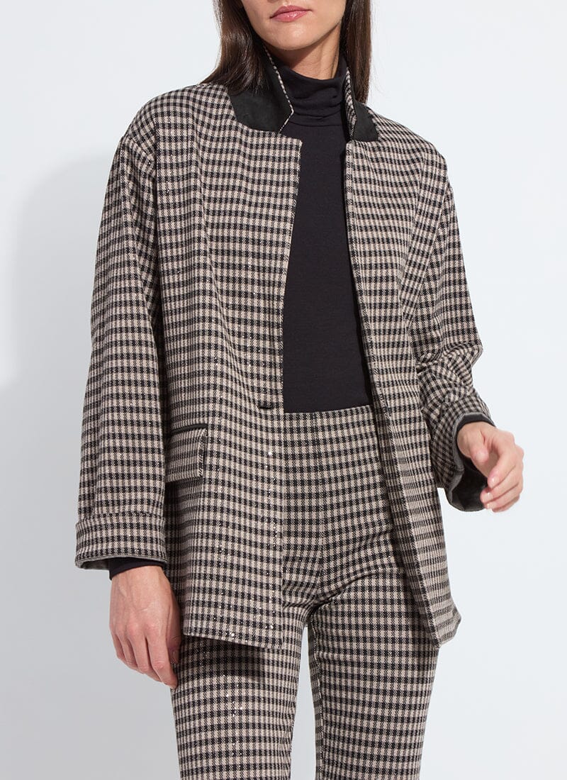 Made from 4-way stretch Silver Foil brushed Ponte Jacquard, the Colleen Metallic Relaxed Blazer showcases a subtle sheen for a festive twist. This versatile blazer, offering drop shoulders, wide sleeves, back vent and functional pockets, showcases Black Vegan Suede detailing along the pocket, under the collar and when cuffed. Style it as a suit with the matching Colleen Metallic Ankle Baby Boot pant or with the Distressed Black Estelle Everyday Flare Denim jean. Half lined with Satin and finished in Satin binding. Machine wash inside out to preserve the foil application. Hang dry.