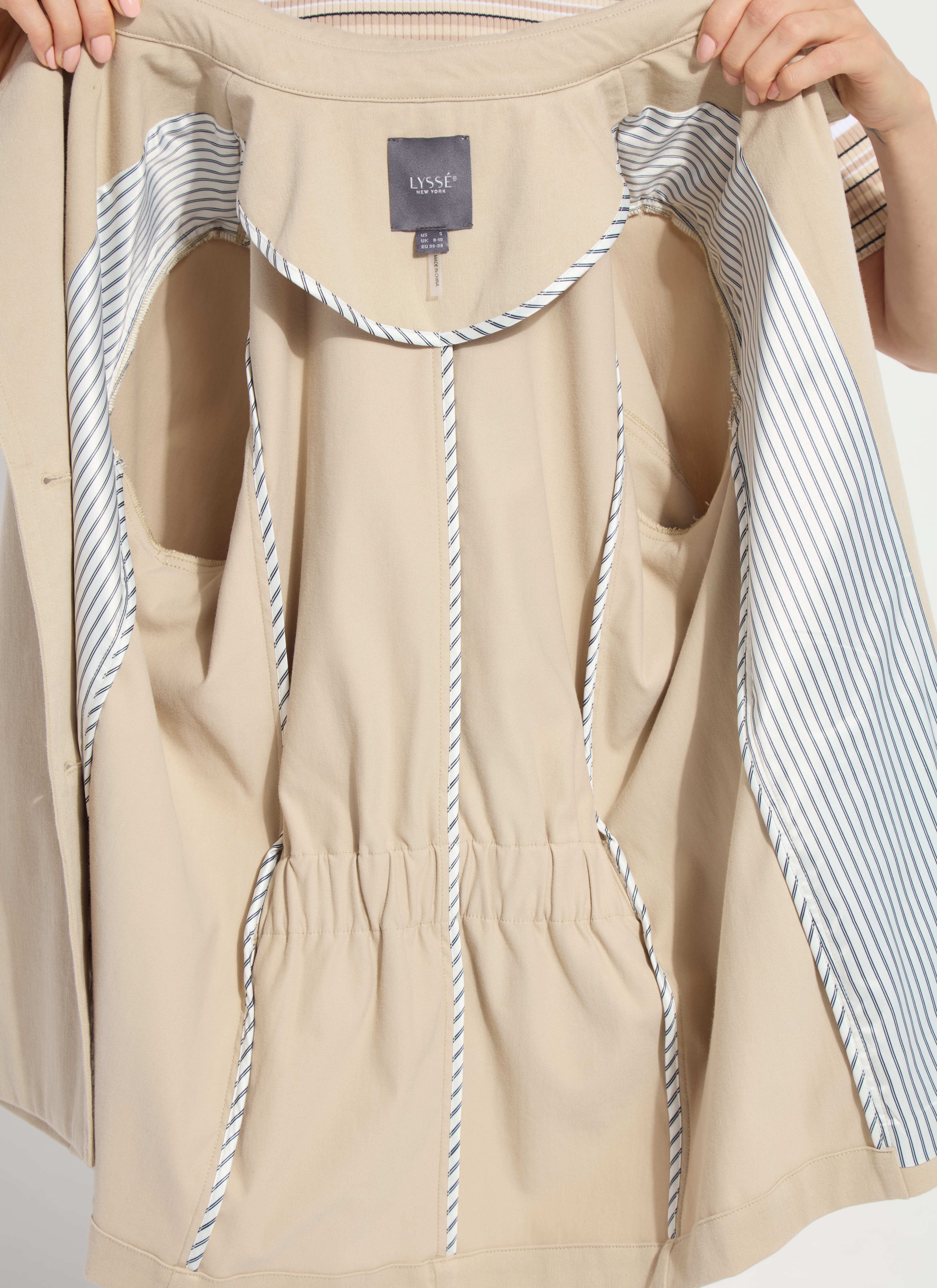 Made from Refined 4-Way Stretch Gaberdine, the Dakota Cotton Cropped Trench is a cropped, double-breasted jacket with a classic front flap, functional front pockets, bracelet length A-line sleeves and a double-self back flap. True to size and machine washable, the Dakota Cotton Cropped Trench is half lined in a striped Satin and features faux horn buttons, an attached belt and an elastic waistband at the center back. It’s perfection when styled with a tee and jeans or the Heidi Striped Rib Knit Top and matching Brinne Side Stripe Trouser.