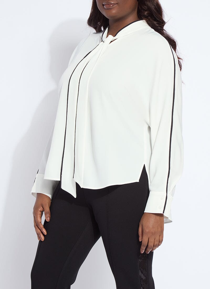 Made from wrinkle-resistant Stretch Woven fabric and offering a relaxed fit, the Daphne Dolman Sleeve Bow Blouse offers a front tie,  legging-friendly length, high-low hem, dolman sleeves and Black contrast piping on the tie, shoulders and sleeves. Featuring 2-way stretch for comfort, the Daphne Dolman Sleeve Bow Blouse styles beautifully with our Hi Waist Vegan Leather Wide Leg pant. Machine washable and will not bleed.