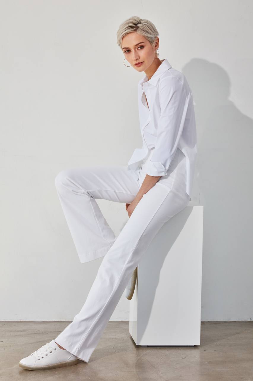 When the typical jean just isn’t enough, look to the Denim Trouser to exude an elevated, polished vibe. These bottoms pull on easily, are made from 4-way stretch Knit Denim and have no side seams. The seams are shifted to the front of the pant for the illusion of slimmer hips. The Denim Trouser skims the hip and thighs before falling into a trouser leg and features back welt pockets. Style with a tucked Connie Slim Button Down and Vegan Suede blazer.