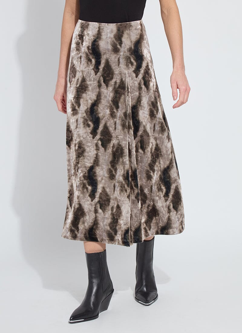 The Dominique St Velvet Pleated Skirt, made from 4-way stretch Printed Crushed Velvet, features a concealed patented waistband, bias cut and deep front left pleat. Stretchy, soft and comfortable, this elevated midi skirt offers beautiful drape and styles perfectly with the matching Dominique St Velvet Top and boots.