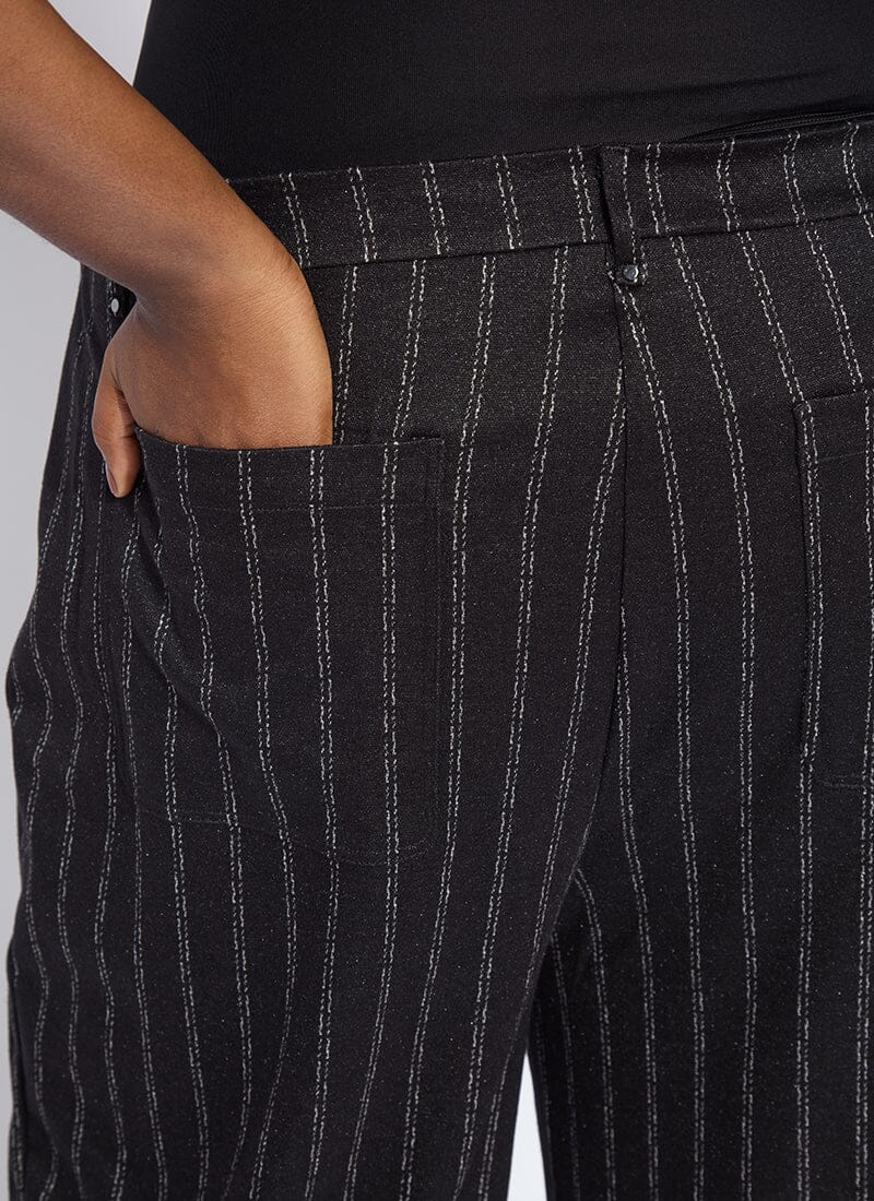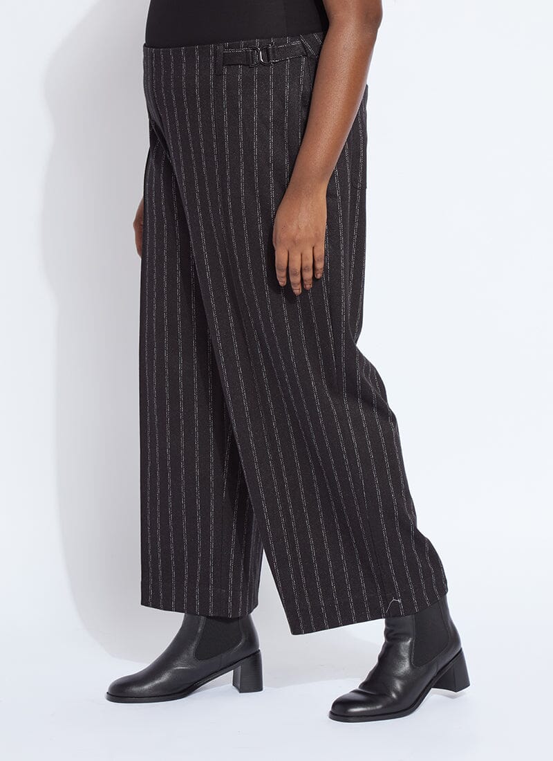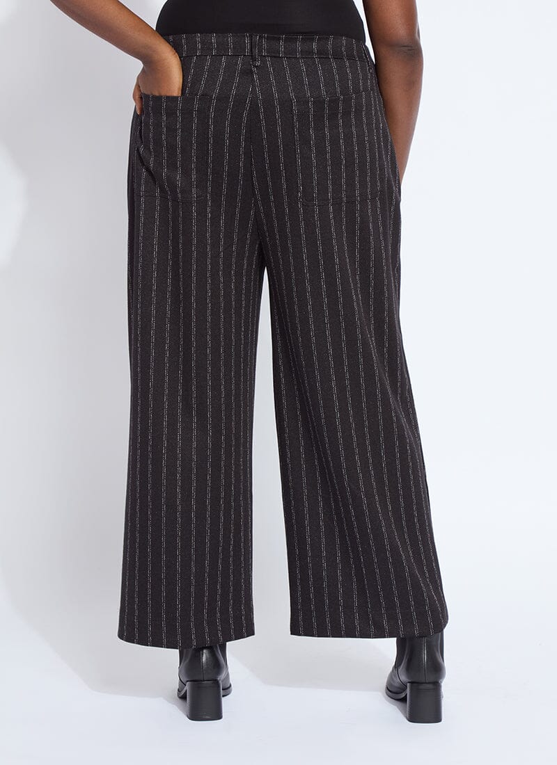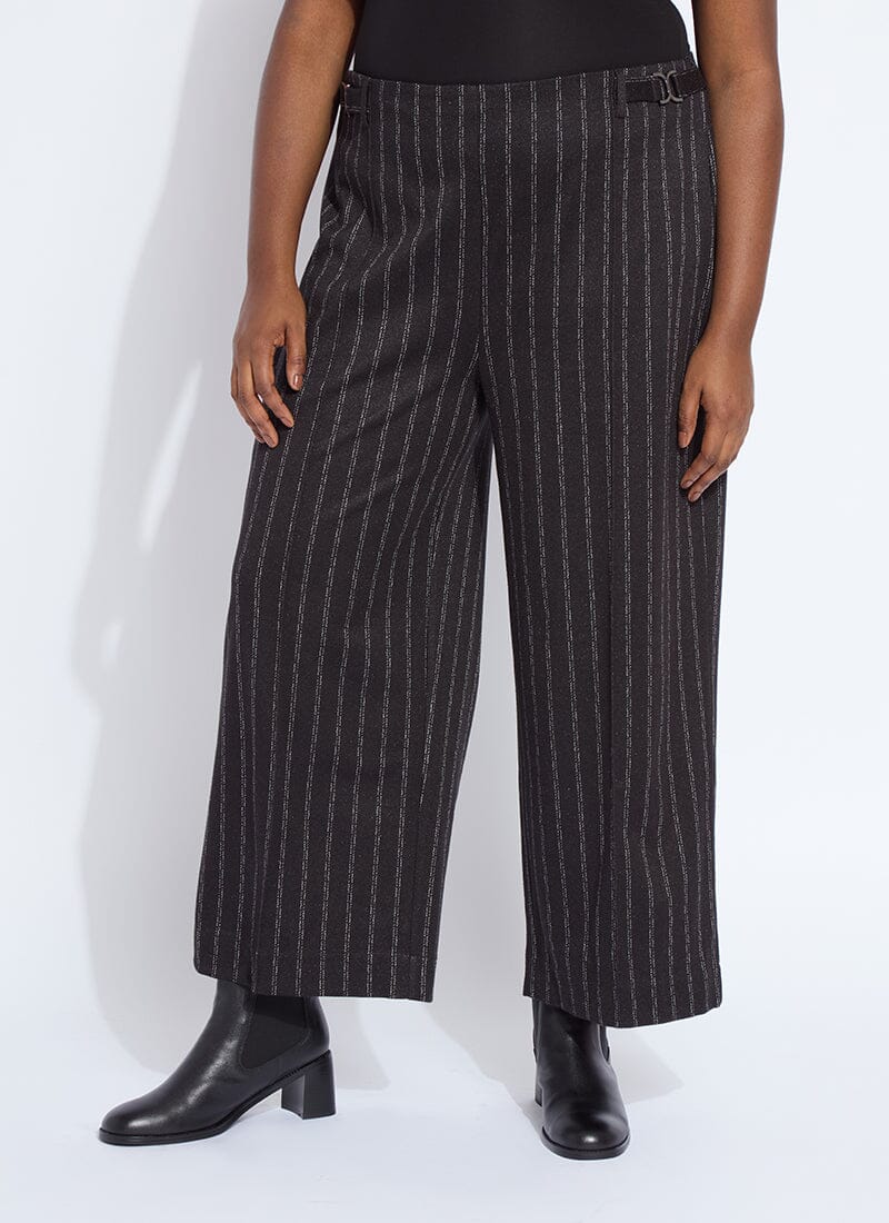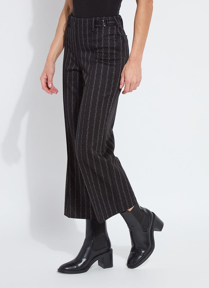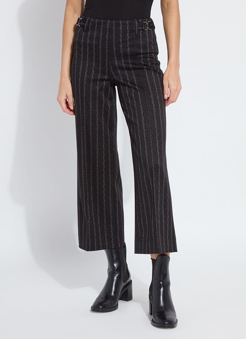 Made from 4-way stretch Brushed Ponte Jacquard, the Isabel Wide Leg Ponte Pant features a concealed patented waistband, back patch pockets and beltloops, front pintucks for a slimming look, and a wide, cropped leg. Detailing includes High Shine Gunmetal buckles at each side of the waist. Warm and cozy, we love the Isabel Wide Leg Ponte Pant partnered with the Essential Turtleneck and Serenity Sequin Cardigan Sweater.