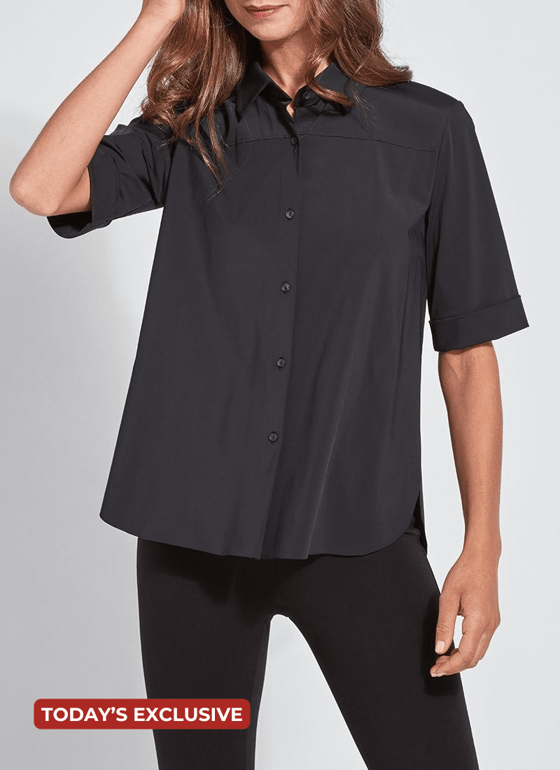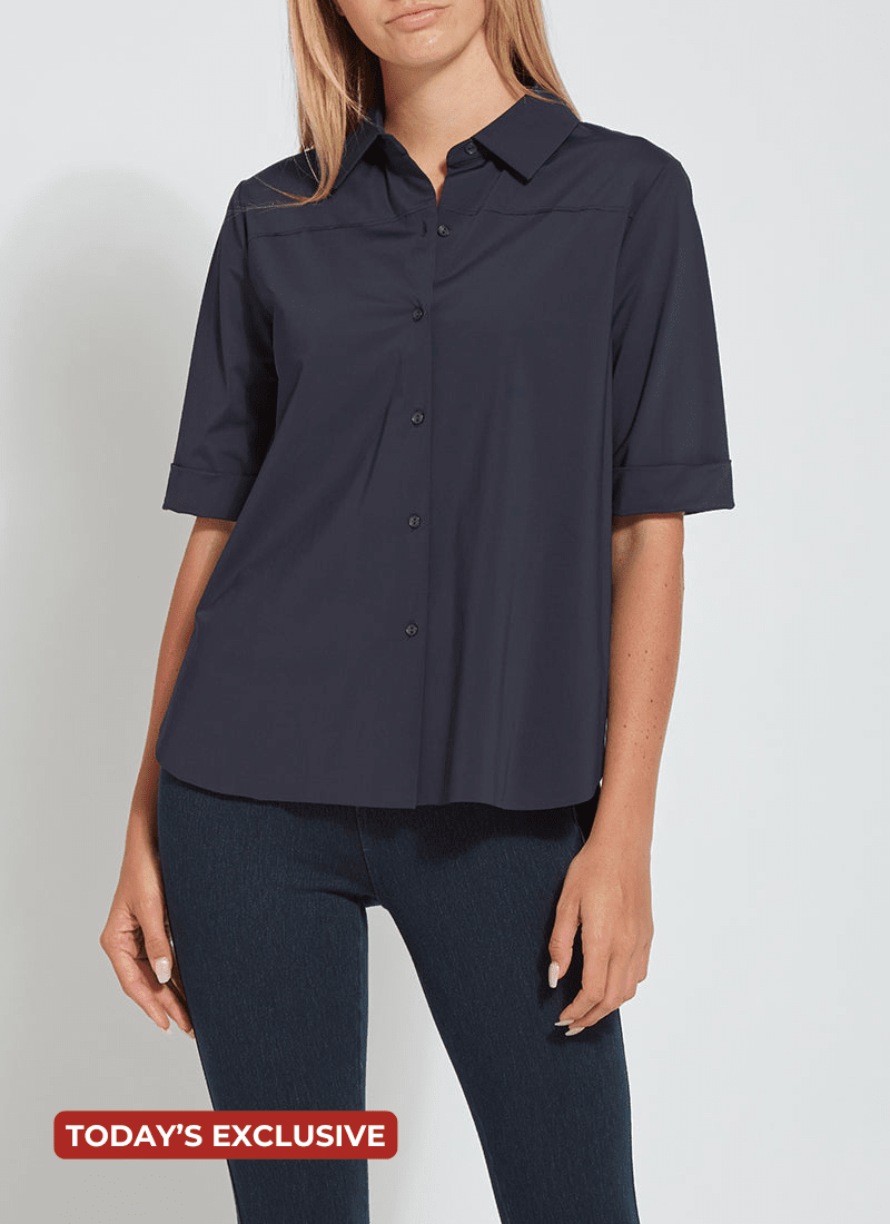 The Josie Short Sleeve Button Down offers a slimmer fit and curved, hip-length hem that tails longer in the back than front. Fashioned from travel-friendly, wrinkle-resistant Microfiber, it features a center back seam, menswear collar, short sleeves with cuffs, and raw-edge detailing. It’s the perfect women’s shirt for tucking into bootcut and wide-legged slacks, as well as skirts.