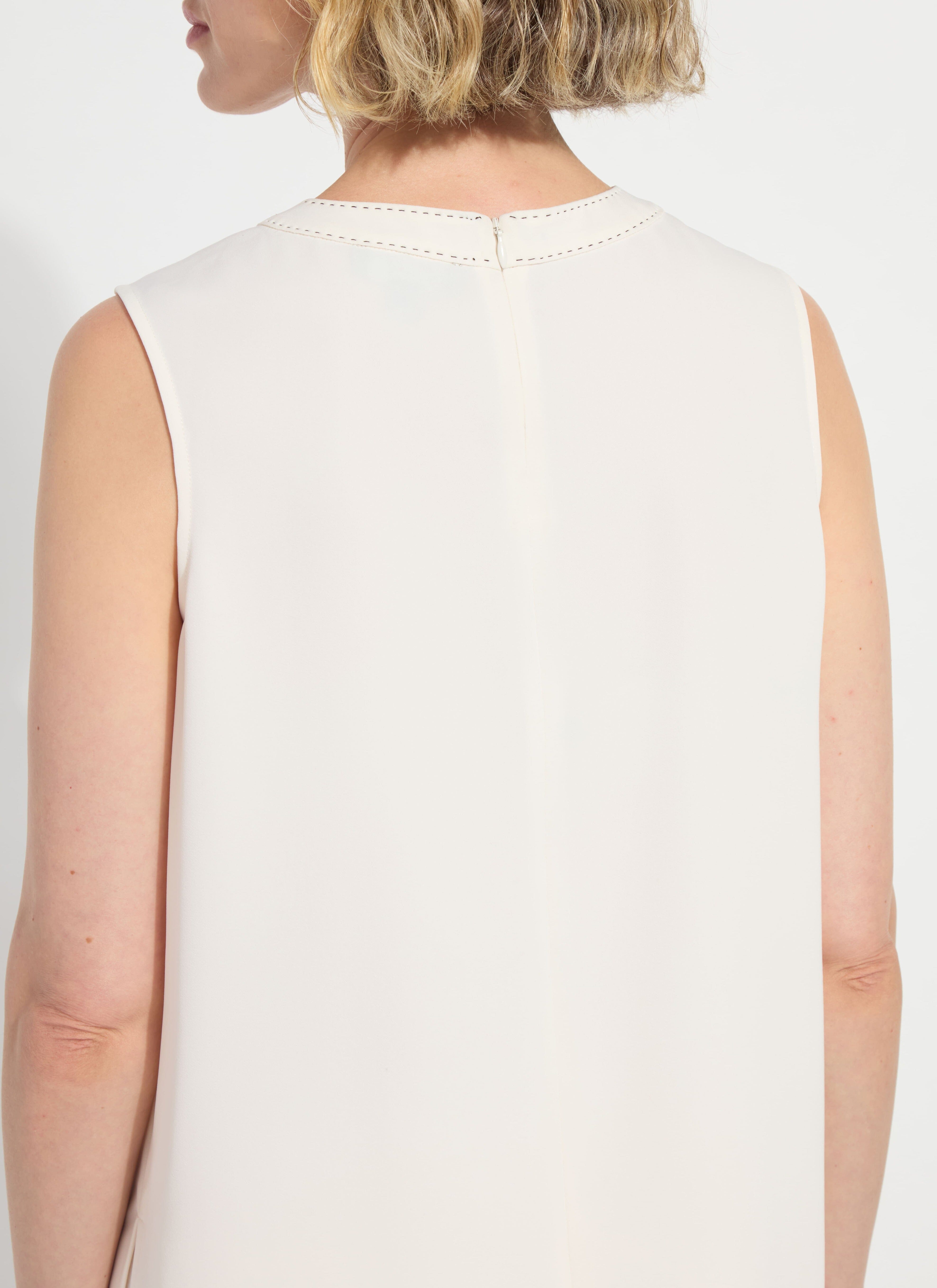 Made from drapey Stretch Woven fabric, the Kavita Crew neck Contrast Stitching Shell offers a true-to-size fit, 2-way stretch, small invisible back zipper and self-bias binding. Hand done pick stitches along the collar band add sophisticated detailing. Partner this wrinkle-resistant shell with our Erin Hi Waist Wide Leg Ponte pant, in Chalk, and sandals. Machine washable.
