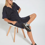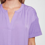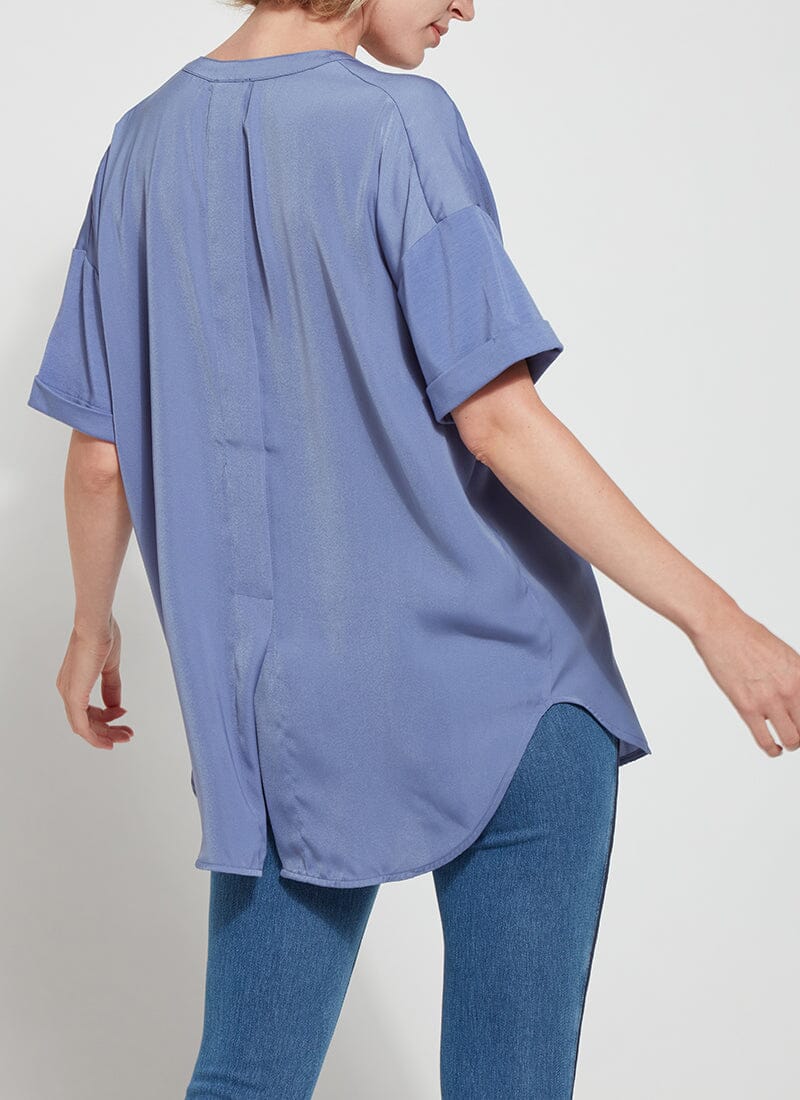 Flowy and oversized, the Leah Short Sleeve Top combines a silky Lightweight Satin body with stretchy, knit Jersey sleeves for elevated style and comfort. Meticulously constructed, this classic top features a clean front placket, center-front vent, rounded high-low hem, and cuffed, drop-shoulder sleeves. Offered in two colors, this pull-on top shines when belted over bootcut jeans. Complete the look with sable leather mules, a backpack and brimmed hat. Upon delivery, steam or hand iron to remove wrinkles.