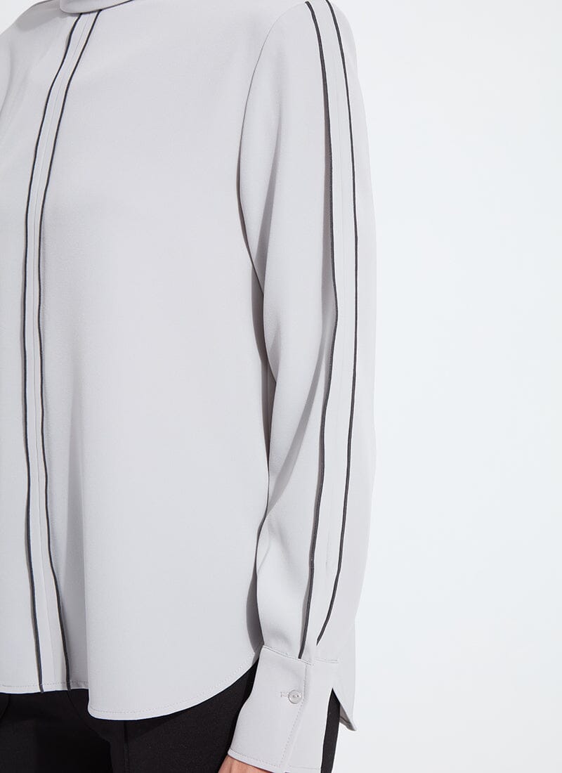 The Lizandra Reversed Collar Blouse offers a funnel neck, keyhole opening in the back with a self-covered button, cuffed sleeves and pull-on styling. Made from wrinkle-resistant Stretch Woven fabric with 2-way stretch, the Lizandra is true to size with contrast-color baby embroidery on the center front and sleeves. Achieve a casual look when styled with jeans or elevated your look by partnering with the Amina Patent Foil Vegan Suede Pant and heels.