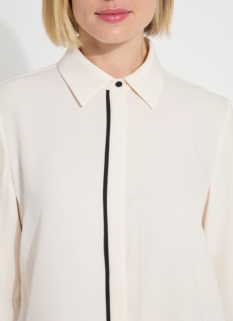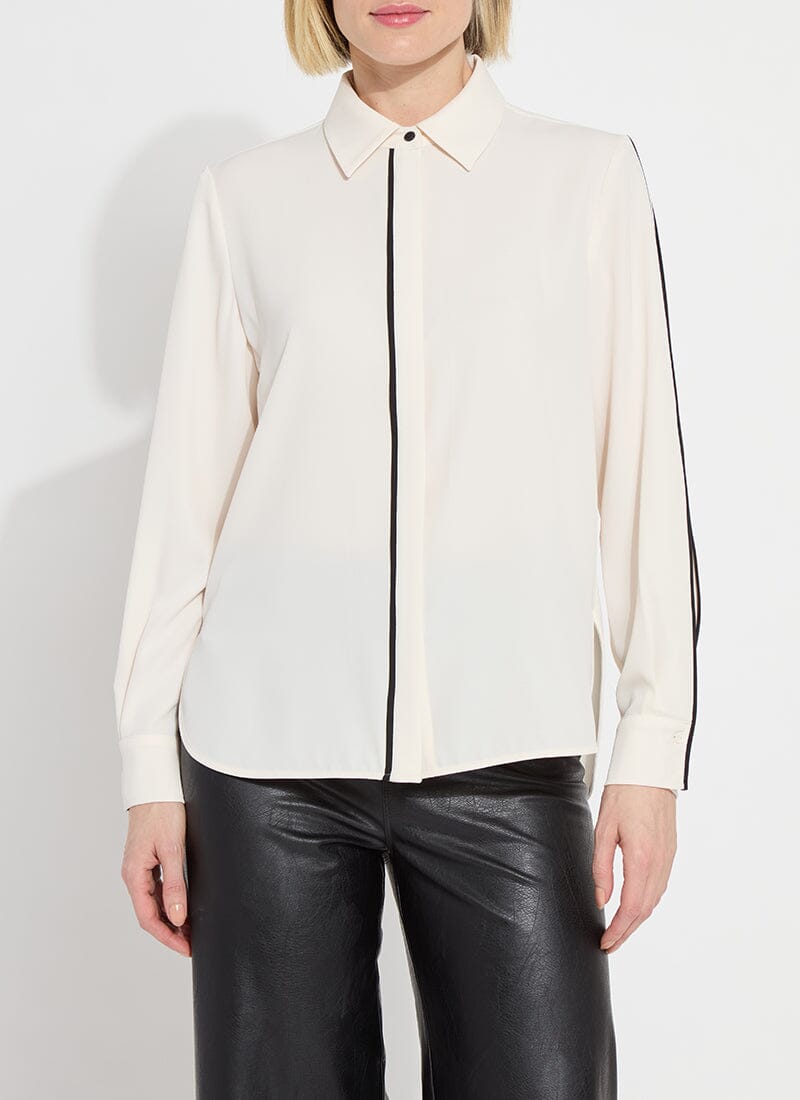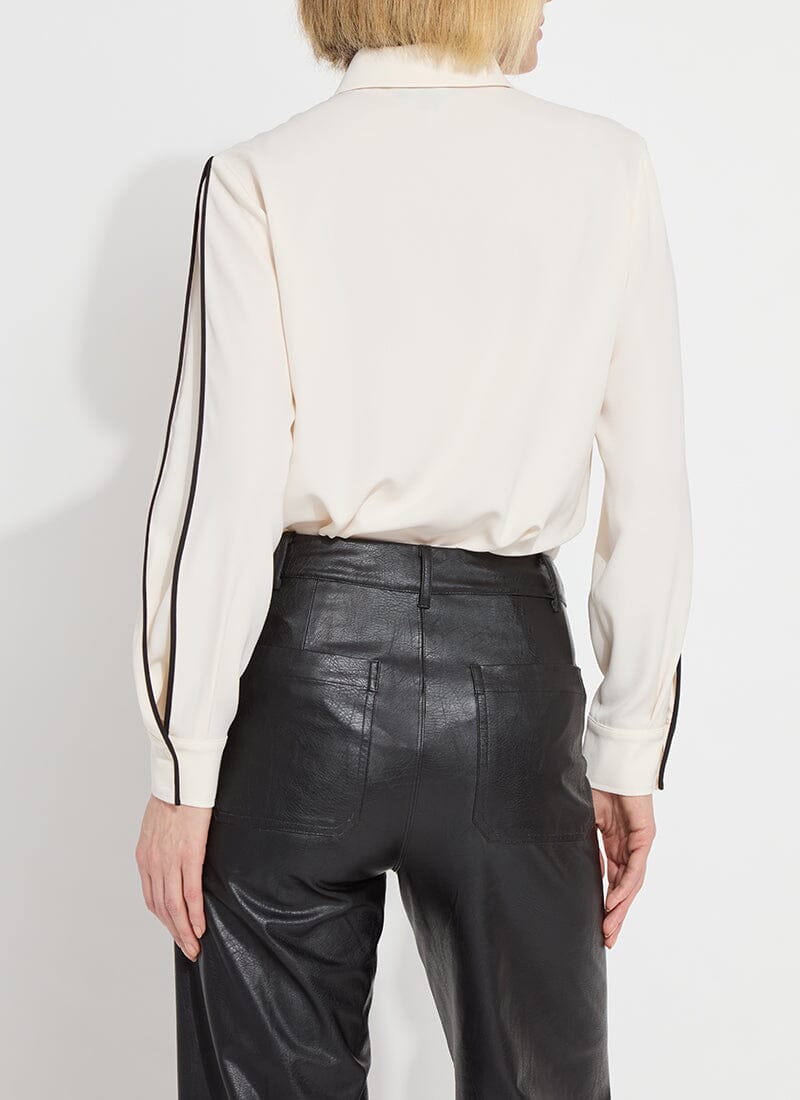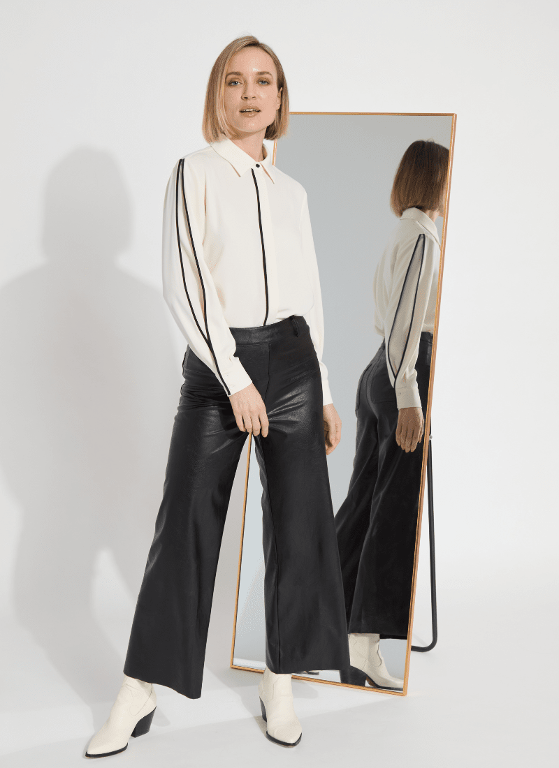 Our Stretch Woven Luna Blouse with Pleated Sleeves offers a straight body, 2-way stretch and a hidden front placket accented with distinctive Black binding. This classic women’s shirt is true to size and features long sleeves with chic pleats and Black trim. Style the Luna Blouse tucked into our Hi Waist Vegan Leather Wide Leg pant, in Black, and ankle boots.