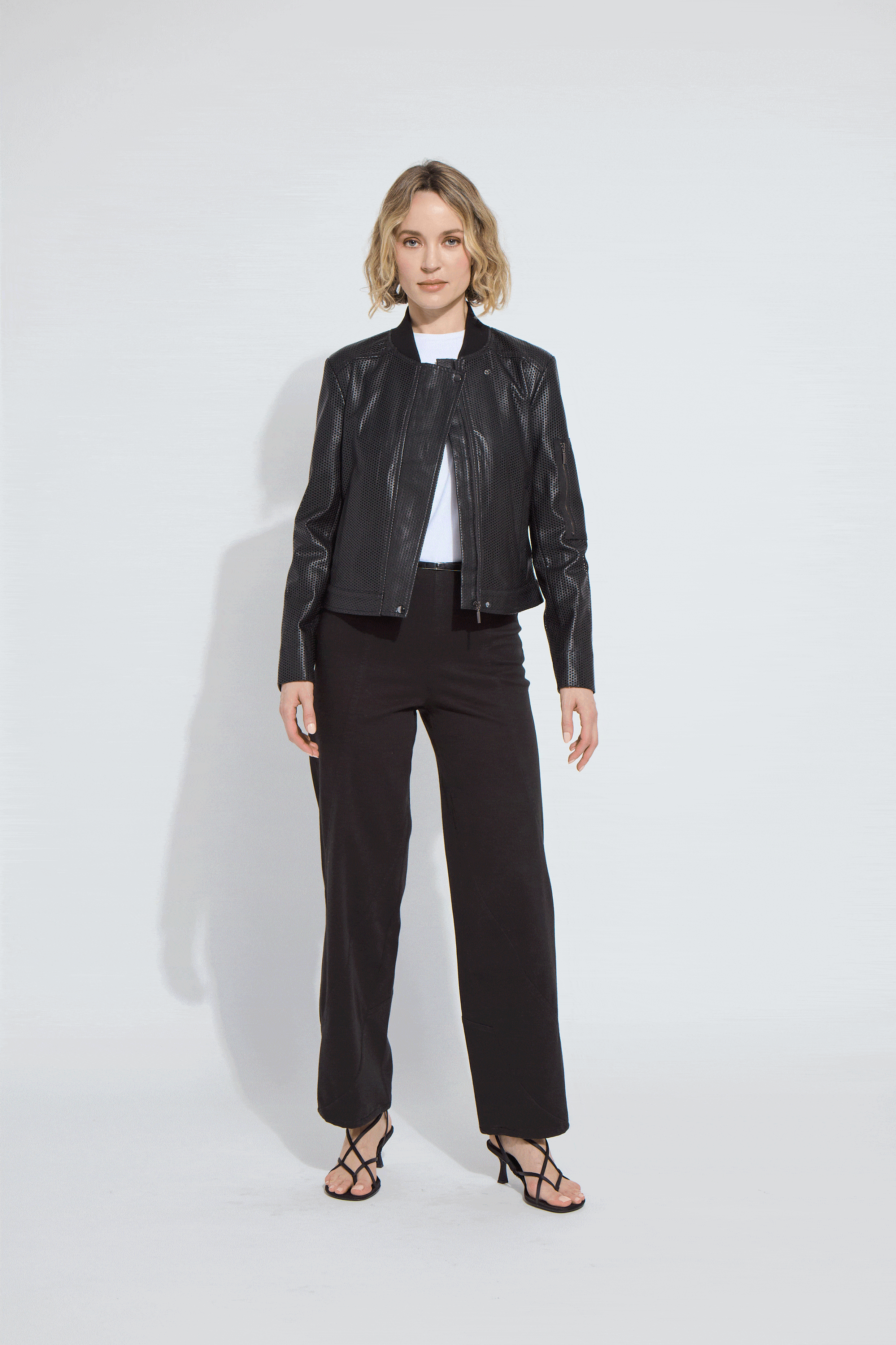Fully lined with lightweight mesh, the Millicent Perforated Vegan Leather Jacket is true to size with a bomber shape and cropped length. This transitional jacket, made from Lightweight Vegan Leather, showcases laser perforations, a front zipper, a right sleeve phone pocket, wrist slits for easy sleeve cuffing, and a rib trim collar with snap front. Layer over the Lysséntials Top with the Amabel Seamed Barrel jean and boots.