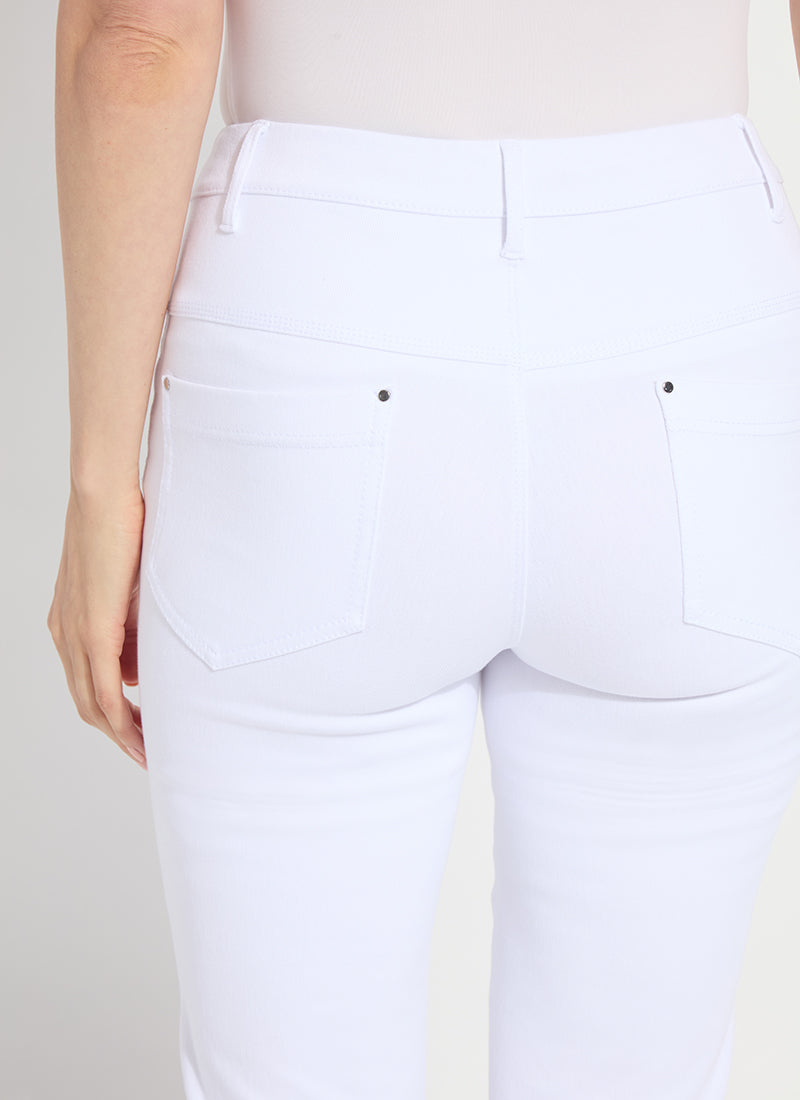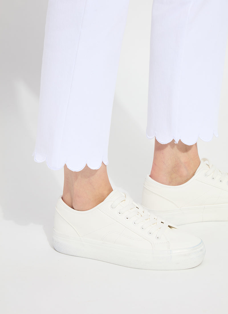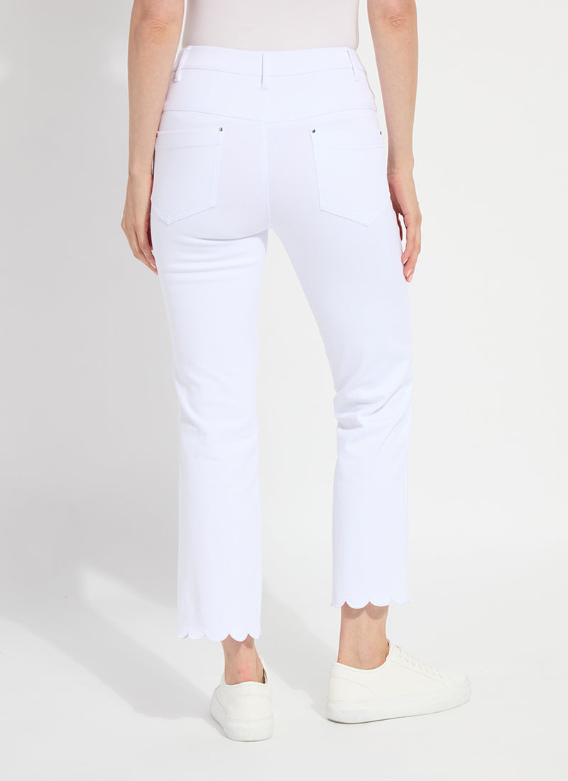 Offering a 27-inch length with a slight leg flare, the Sage Scallop Edge Ankle Baby Boot is ideal pant for shorter women. Made from 4-way stretch Knit Denim, these ankle-length bootcut pants offer a concealed patented waistband, embroidered scallop hem, back patch pockets with metal grommets and anatomical seaming that lifts and contours. The Sage Scallop Edge Ankle Baby Boot jean skims the hips and thighs before falling into an open bootcut leg. Style with a tee and the Della Denim Cropped Blazer Bracelet Slvs.
