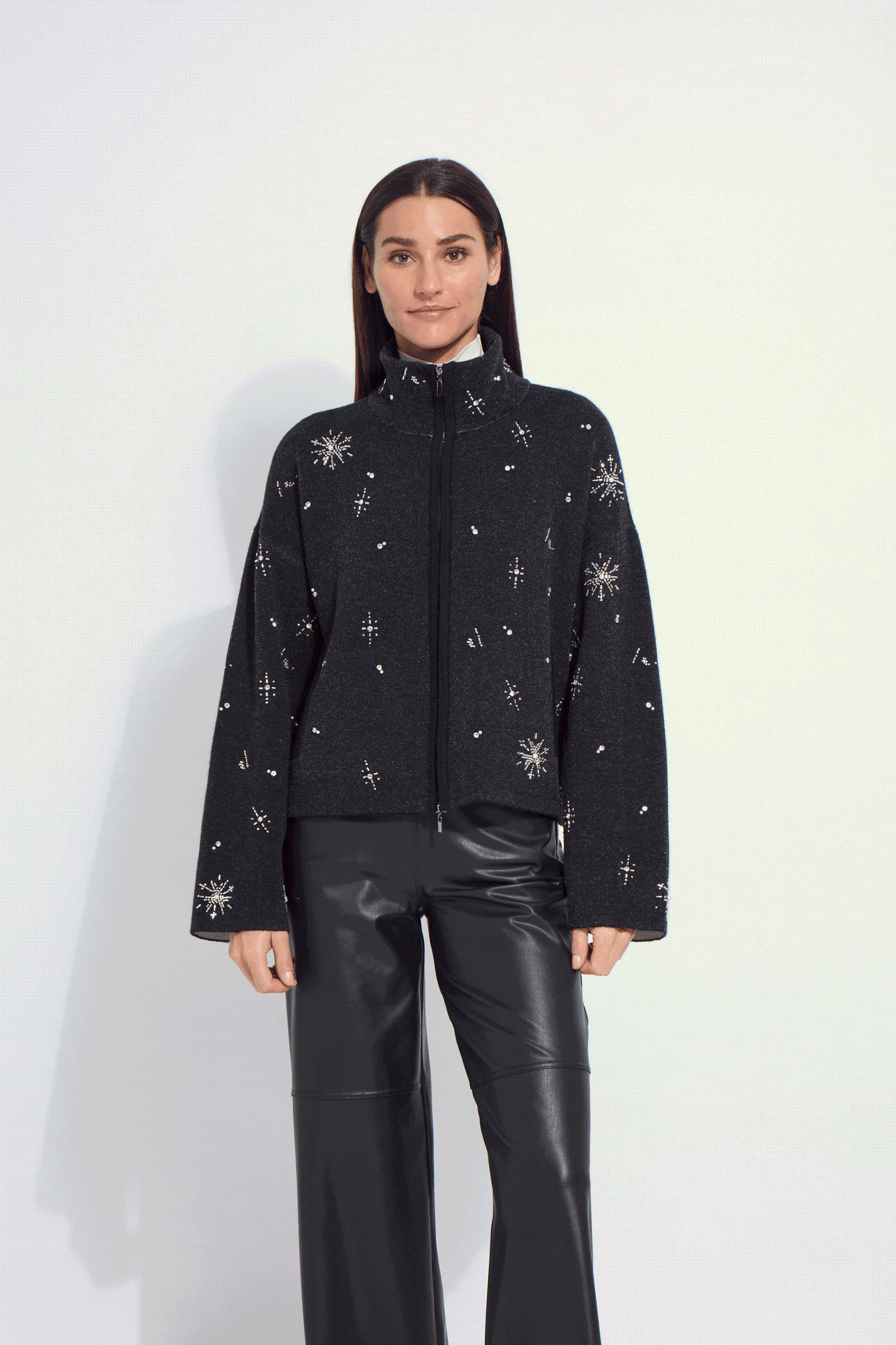 Offering a relaxed-oversized fit, the Scottie Embellished Knit Jacket offers rounded sleeves, clean edges, functional pockets and a zip front. Made with Teddy Bear Yarn and Cozy Knit outside and fluffy Teddy Bear yarn inside, the Scottie sweater coat showcases complex embroidery with Crystals and Pearls that are punched and attached by hand. Style this special coat with our Georgia High Neck Tencel Jersey Top and Azara Wide Leg Vegan Leather Pant. Machine wash inside out and lay flat to dry. Store folded, never hung.