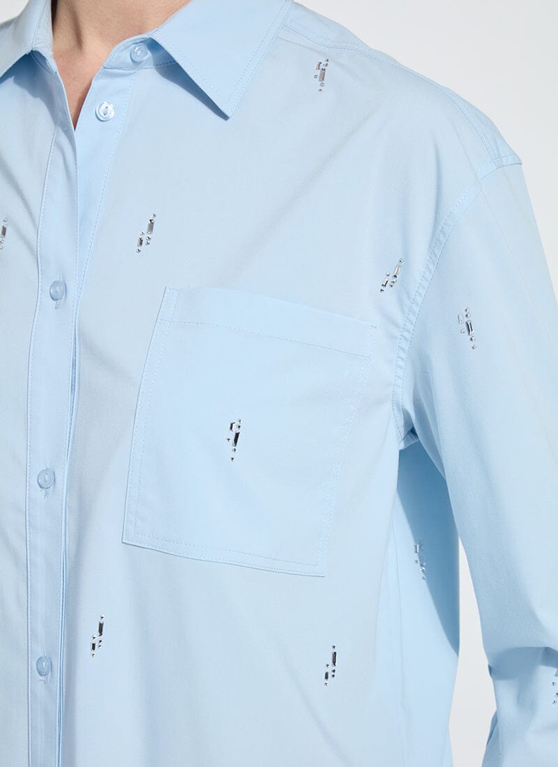 Made from Micro Stretch Shirting, the Skye Crystal Embellished Shirt features drop shoulders, a single front patch pocket, back yoke, back pleats and an all over placement of heat-set Crystal Rhinestones. Offering comfortable 2-way stretch and a soft, peachy feel, The Skye Crystal Embellished Shirt has a relaxed fit and shirttail hem. Style it tucked into the Erin Hi Waist Wide Leg Denim jean and boots. Turn inside out before machine washing.